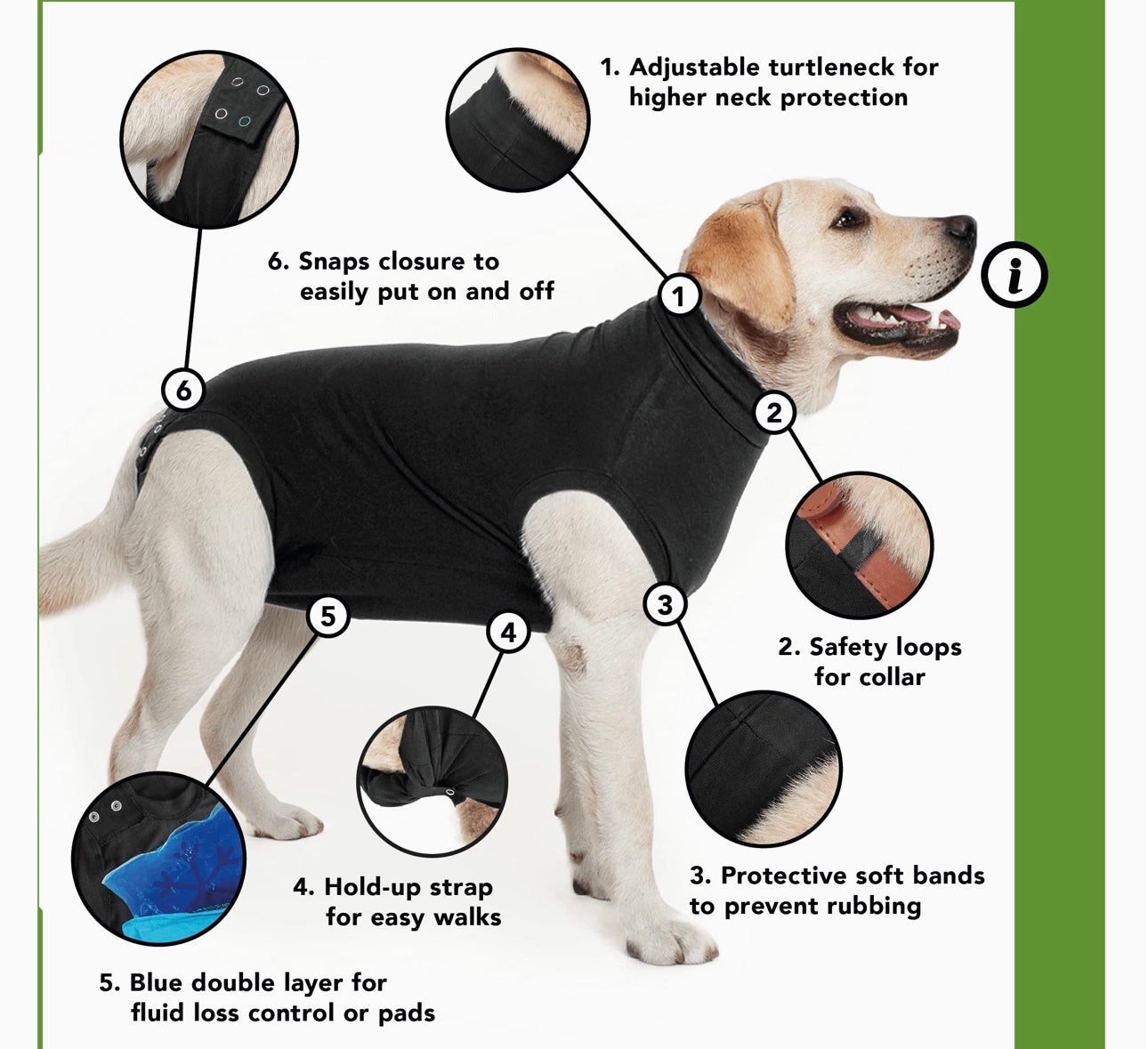 Multi-purpose full body shirt, designed to cover and protect (Post Operative) wounds, spays/neuters, sutures, skin-conditions, allergy rashes, hot spots, ointment, when in heat, light incontinence and for nursing pets to give them a break. Also prevents overgrooming and hair loss. Your pets, house and car will love you too.